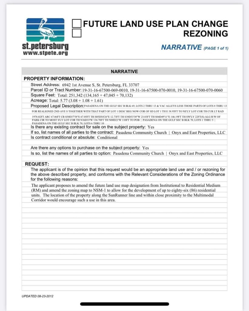 Bottom line: it is accurate to say that for Onyx+East to develop the properties and for Pasadena Community Church to complete its plans to renovate our oldest building, and provide a new, safe, and updated preschool, the two parcels would have to be rezoned. The rezoning that the developers are seeking is a low-density multifamily designation allowed by St Petersburg city rules. We have always known and communicated that anything other than free-standing single residences would require a zoning change and have sought to sell the property with the developer who would seek the least disruptive zoning change for the community. That is what this application would do.